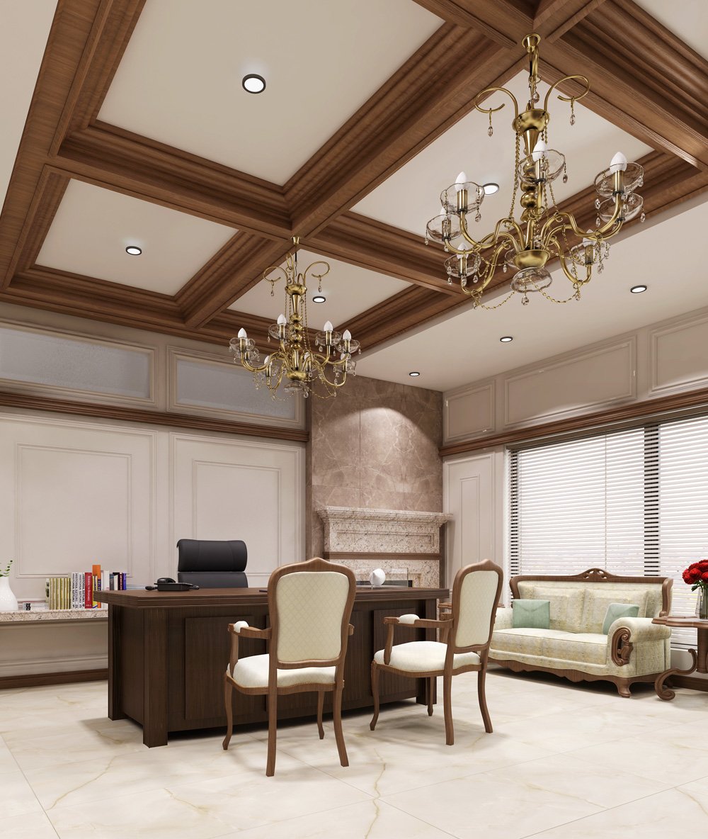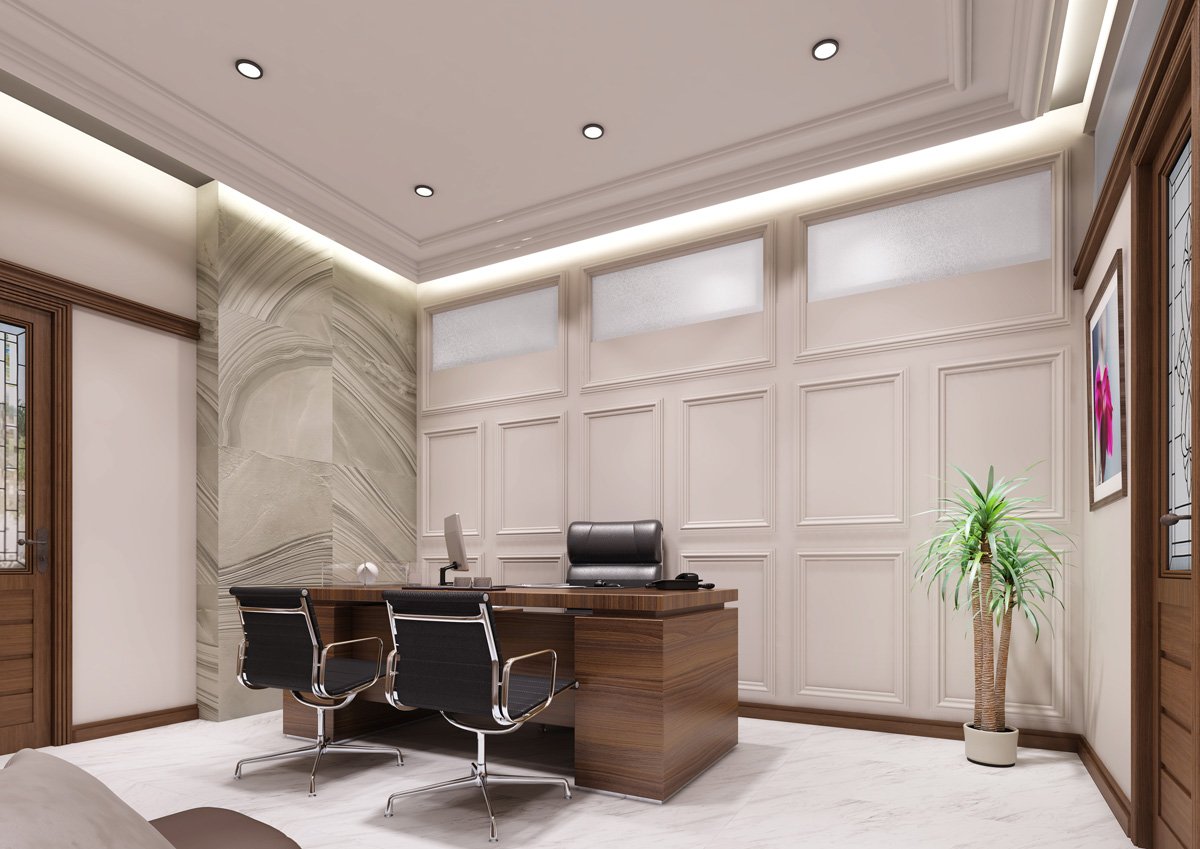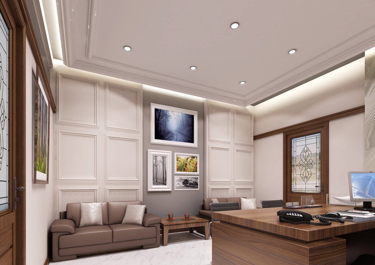 A creative blend of wooden and marble fittings is the core concept of this project. Special emphasis was laid on the renovation of the 20×20 ft office of the CEO, enhanced with a wall-mounted fireplace and a mahogany wooden door with cutting edge glass.AGreek Doric column was meticulouslyconstructed to cover the entrance of the building.